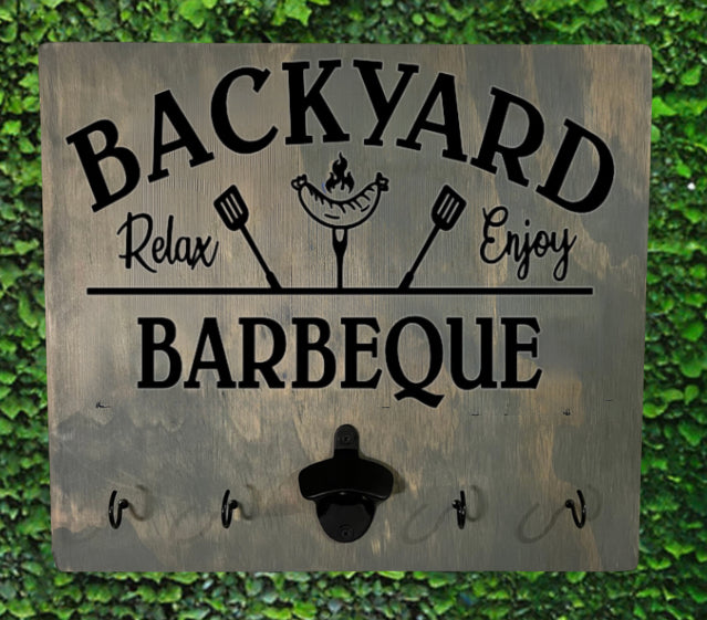 These large signs are solid wood and can be stained to any color within our stain chart. They are sealed to protect the wood from deteriorating in any weather. This item is great for anyone that loves to BBQ! Comes with bottle opener and hooks for the BBQ utensils.