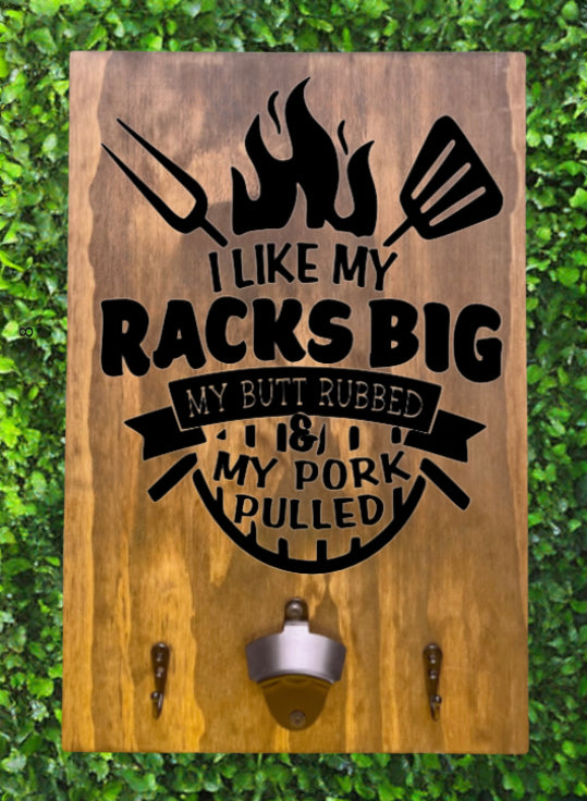 These large signs are solid wood and can be stained to any color within our stain chart. They are sealed to protect the wood from deteriorating in any weather. This item is great for anyone that loves to BBQ! Comes with bottle opener and hooks for the BBQ utensils.