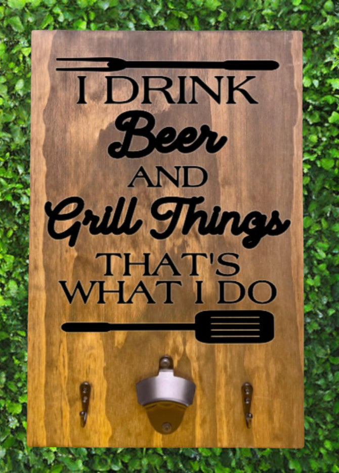 These large signs are solid wood and can be stained to any color within our stain chart. They are sealed to protect the wood from deteriorating in any weather. This item is great for anyone that loves to BBQ! Comes with bottle opener and hooks for the BBQ utensils.