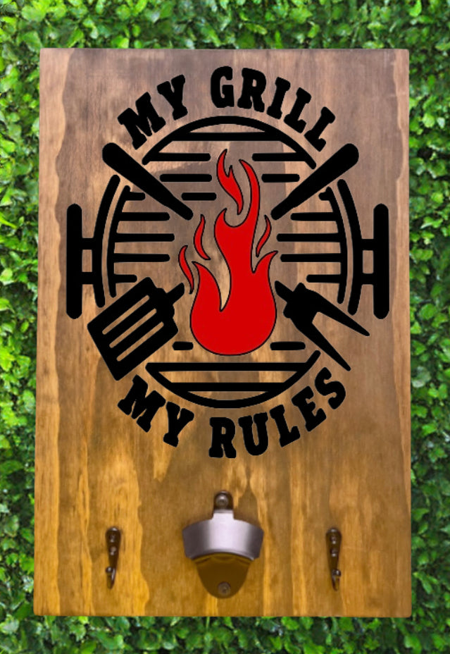 These large signs are solid wood and can be stained to any color within our stain chart. They are sealed to protect the wood from deteriorating in any weather. This item is great for anyone that loves to BBQ! Comes with bottle opener and hooks for the BBQ utensils.