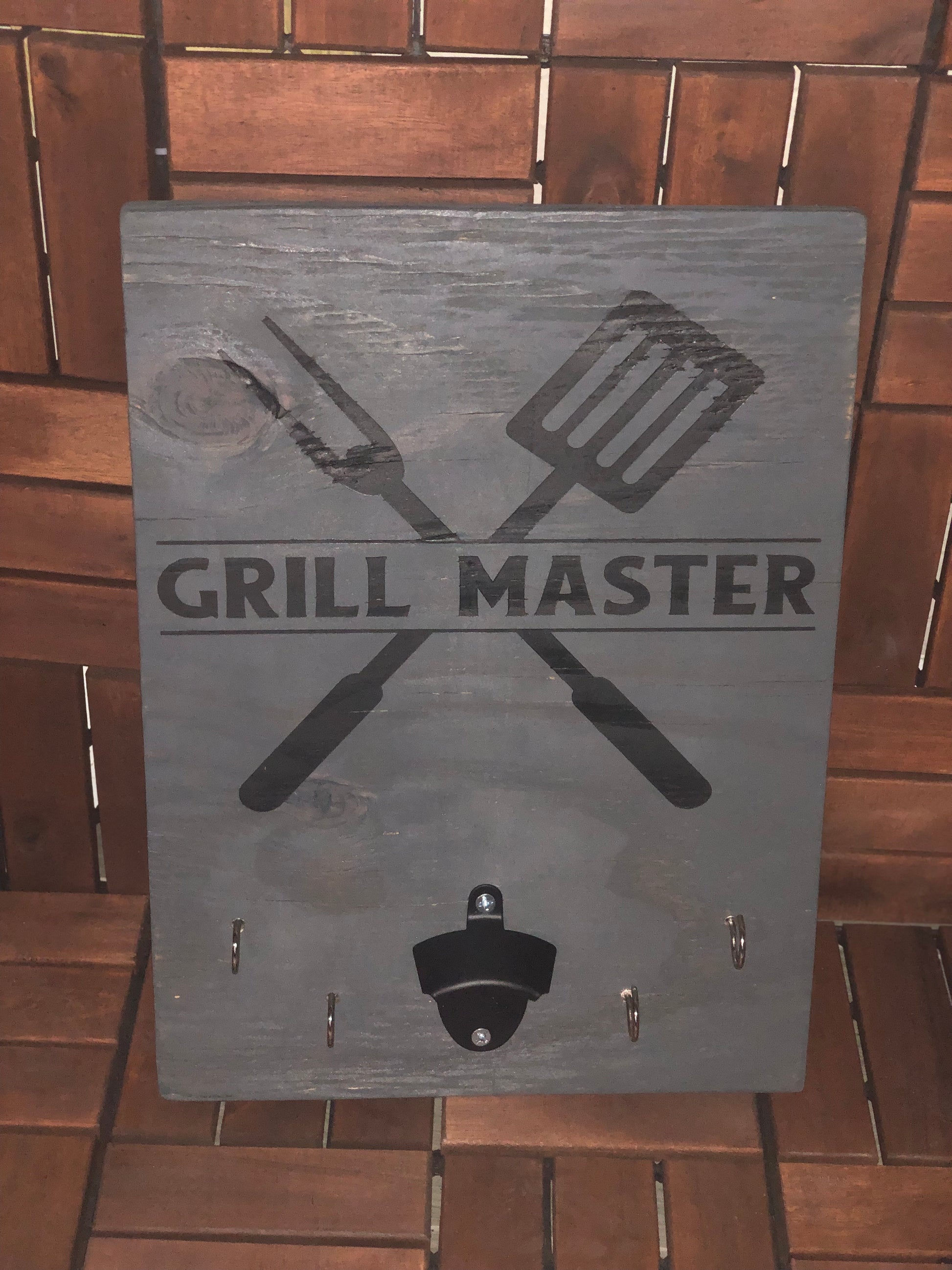 These boards are solid wood and can be stained to any desired color within our stain chart. They are sealed to protect the wood from deteriorating in any weather. They are completely customizable. The board includes a steel bottle opener and hooks to hang BBQ utensils.